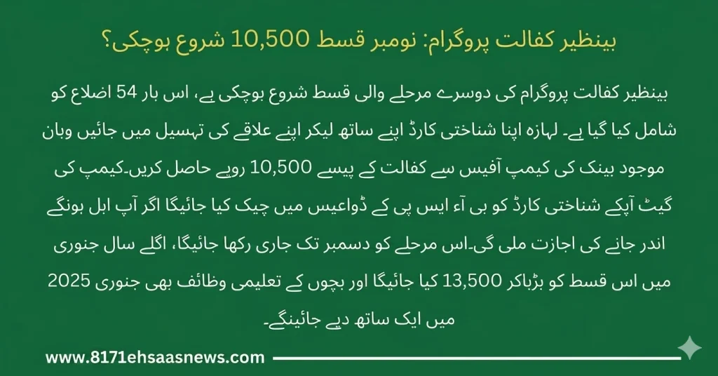 According to the latest announcement by the Benazir Income Support Programme (BISP), the Phase 2 payments of the Benazir Kafaalat Program started on November 14, 2024. In this phase, eligible women received Rs. 10,500, distributed across 54 districts in all provinces, including Gilgit-Baltistan and Azad Jammu & Kashmir.