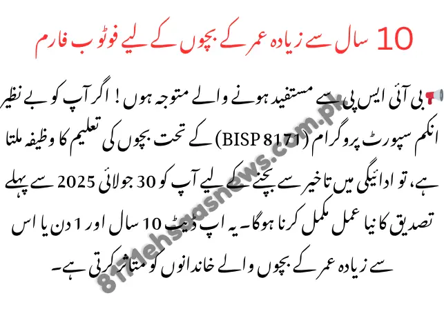 📢 Attention BISP Beneficiaries! If you receive child education stipends under the Benazir Income Support Program (BISP 8171), you must complete a new verification process before July 30, 2025, to avoid payment delays. This update affects families with children aged 10 years and 1 day or older.