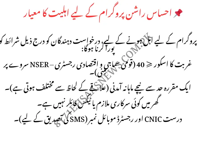 | Ehsaas Rashan Riayat Program | Residents of 36 districts in Punjab | Family income below the NSER poverty line, not already benefiting from similar Ehsaas Rashan Scheme programs | SMS CNIC to 8123, then online portal if eligible |